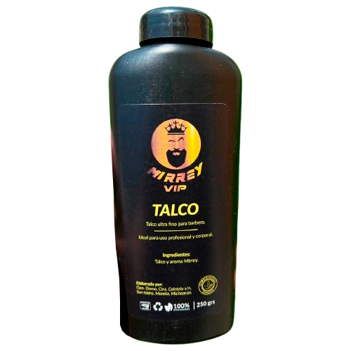 Talco súper fino, adecuado para eliminar todo el cabello recién cortado con el mismo aroma de la Marca Mirrey agradable, fresco y vanguardista
